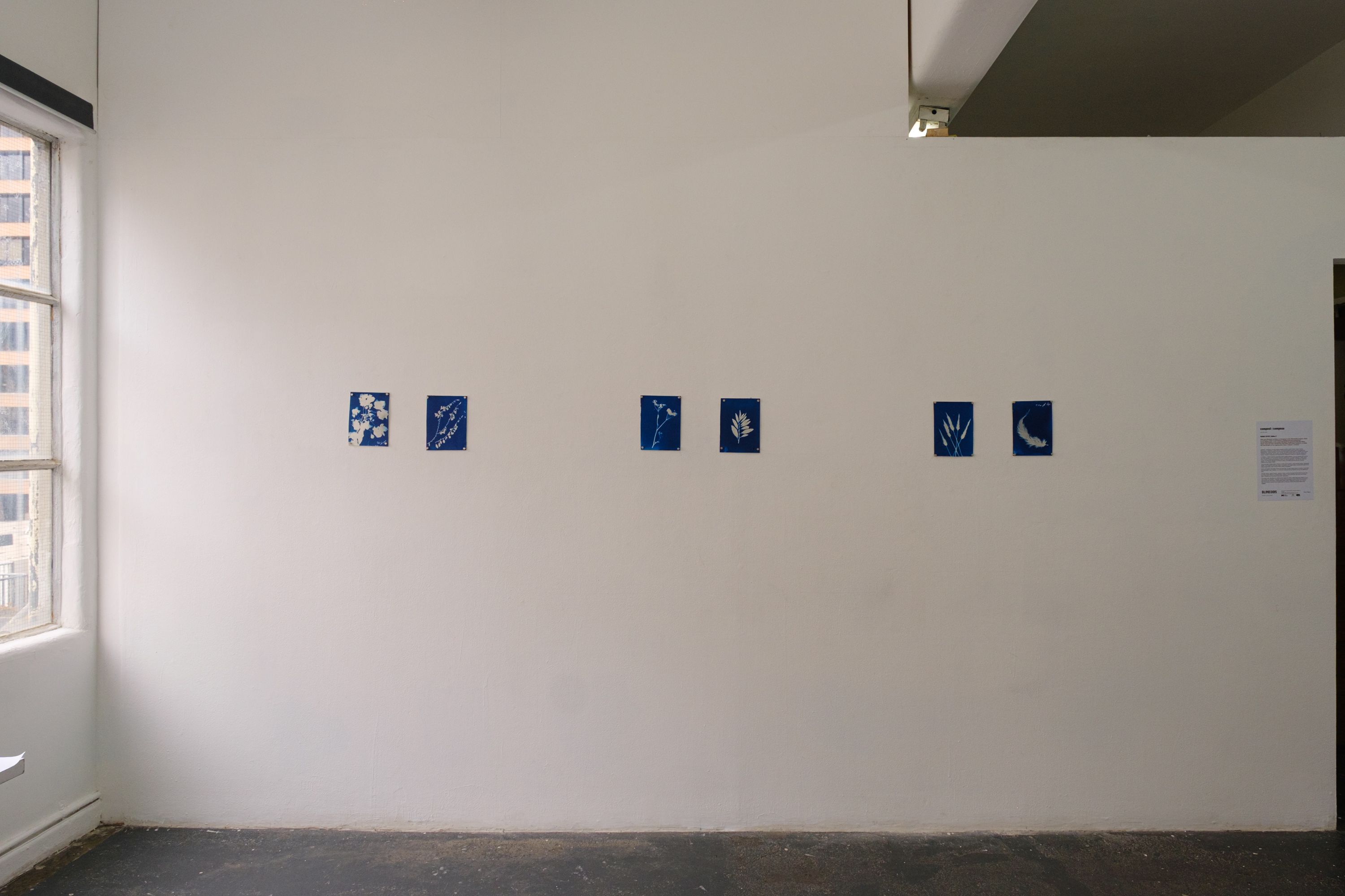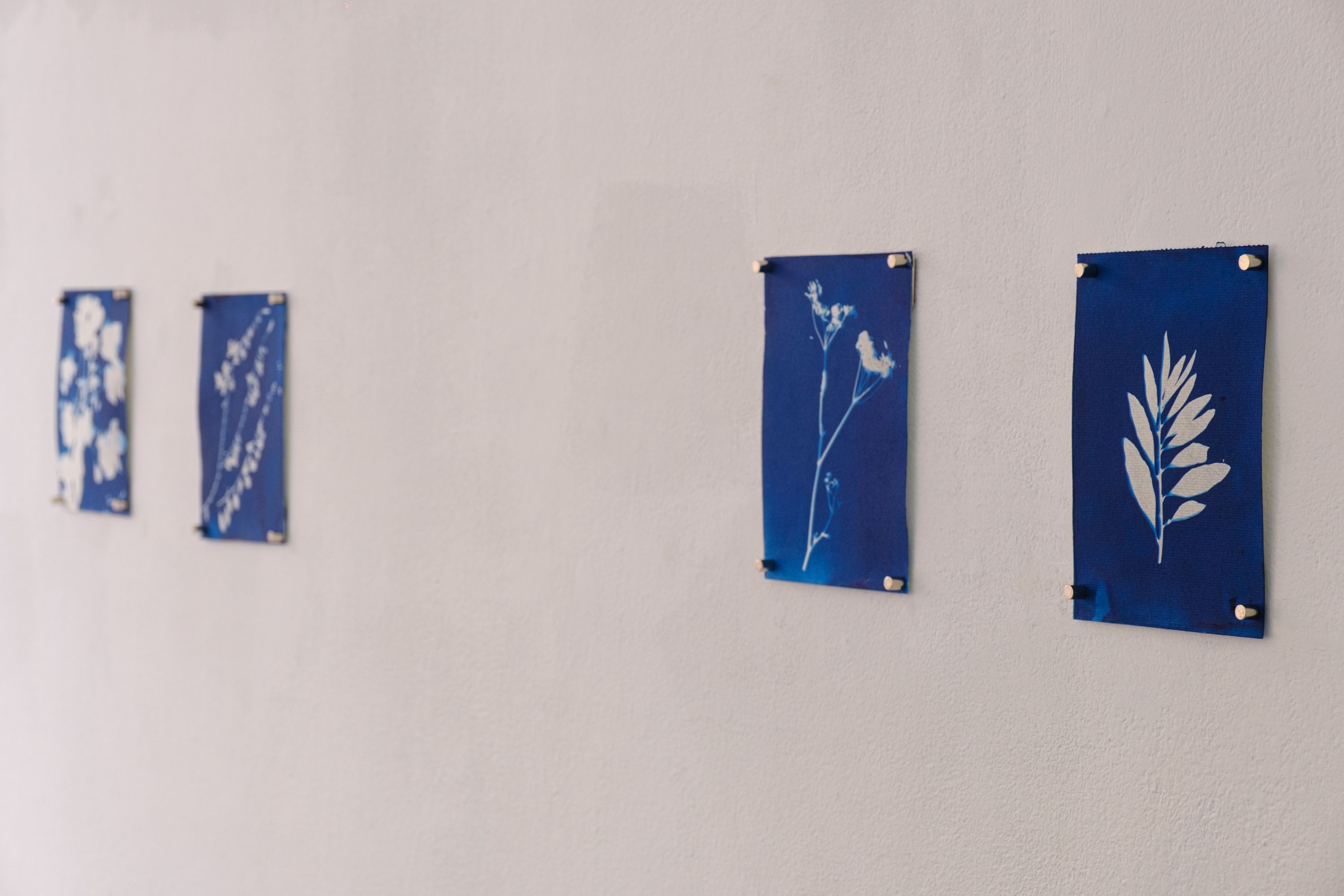 Some cyanotypes have been toned with black tea. All were made without a camera, using light-sensitive paper, plant material, and elements collected during fieldwork across the Bethlehem area.