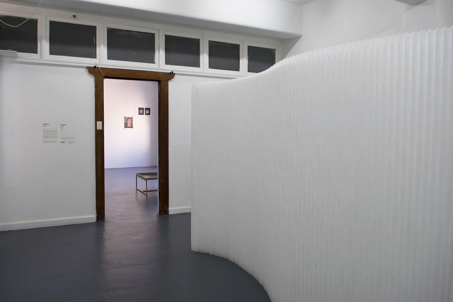 In Perlustrata No. 1, a translucent, snow-white textile configured a pleated line in a phenomenological intervention of geometric simplicity. The line took the form of a three-dimensional double curve within Blindside's Gallery Two, redefining its architectural space.