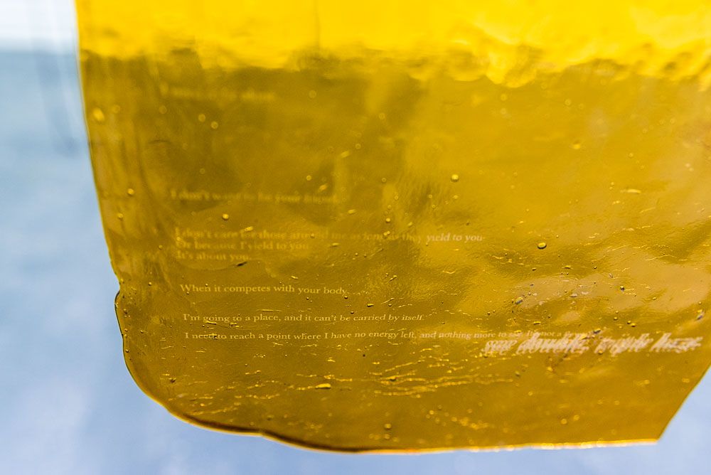 We move our body through, in, out, around, over and under spaces. We forget what was in the past and the impressions that we placed of ourselves onto our surroundings. These traces (in reference to a mark, object or other indication of the existence or passing of something) that are left are physical and psychological, visible and invisible. What are the implications of contact? A trace of energy? But then, contact – what are the boundaries of contact? Your hand touching my hand? Me looking at you, looking at me, looking at you. My vision touches the subject in my sight. My grasp on honey – something unattainable and uncontrollable? An embrace. What is it to manipulate and bear power on materials which contradictorily actually have the power over you?